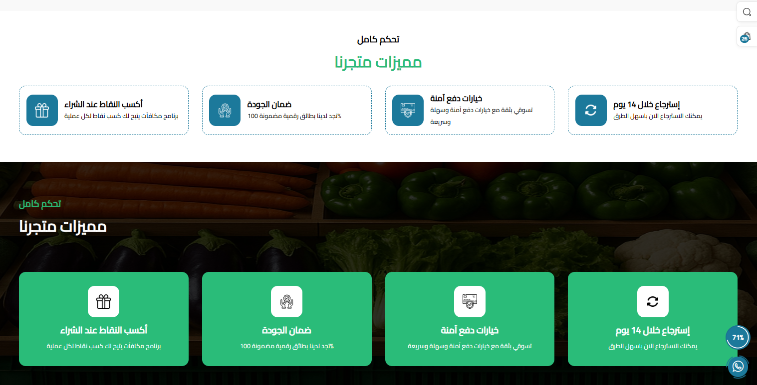 قسم لعرض أسباب اختيار متجرك أو مميزاتك التنافسية في شكل بطاقات مع أيقونات وأرقام وإحصائيات.