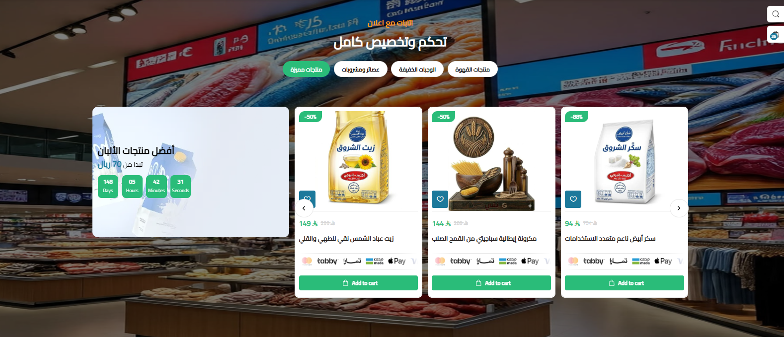 بانر رئيسي يدعم الصور والفيديوهات مع إمكانية إضافة نصوص وأزرار دعوة للإجراء وعداد تنازلي للعروض.