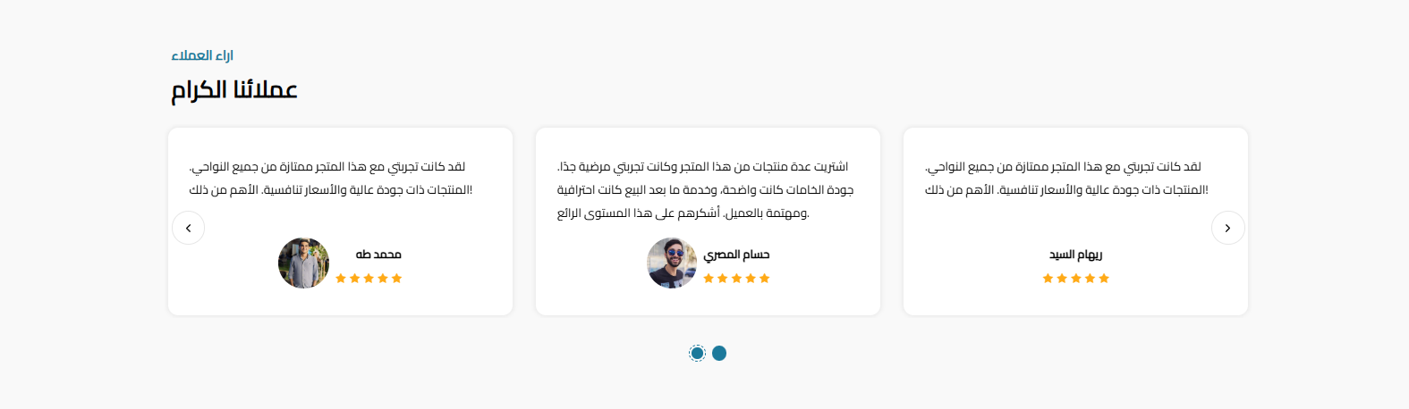 قسم لعرض تقييمات وآراء العملاء بشكل بطاقات في سلايدر أو قائمة، مع دعم الصور والنجوم والاسم والمنصة.